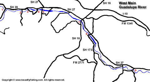 15. The Guadlupe runs beneath I-10 here, just southeast of Comfort, Tx. Exit the highway on the southeast side and drive down the dirt road. Proceeding straight down the dirt road, the river crosses under the I-10 bridge. The water under the bridge is deep and the current is too fast for fishing from float tubes or canoes.