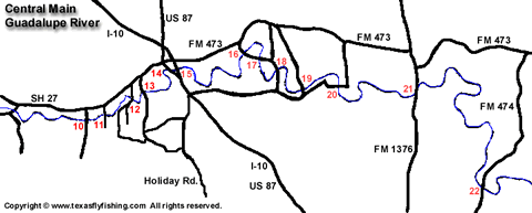 27. Guadlupe Canoe Livery provides canoe rental and shuttle service here at the US 281 crossing. Access to the area is by floatation only. Floating into the various creeks that enter the river here provide some good opportunities at large fish.